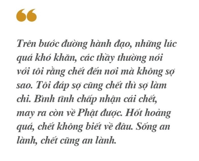 Trên bước đường hành đạo, những lúc quá khó khăn, các thầy thường nói với tôi rằng chết đến nơi mà không sợ sao. Tôi đáp sợ cũng chết thì sợ làm chi. Bình tĩnh chấp nhận cái chết, may ra còn về Phật được. Hốt hoảng quá, chết không biết về đâu. Sống an lành, chết cũng an lành.