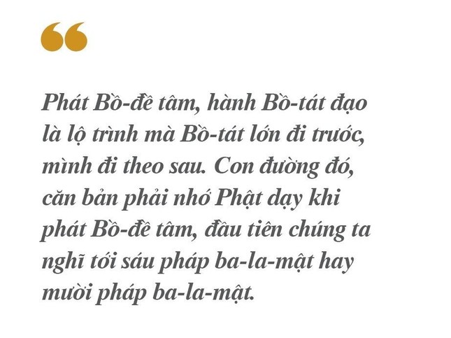Phát Bồ-đề tâm, hành Bồ-tát đạo là lộ trình mà Bồ-tát lớn đi trước, mình đi theo sau. Con đường đó, căn bản phải nhớ Phật dạy khi phát Bồ-đề tâm, đầu tiên chúng ta nghĩ tới sáu pháp ba-la-mật hay mười pháp ba-la-mật. Kinh tạng Nguyên thủy cũng có ghi rõ điều này, không phải chỉ có kinh Đại thừa nói đến. Trong kinh Nguyên thủy, Phật cũng dạy các thầy Tỳ-kheo làm, nhưng các thầy ít làm, mà cư sĩ làm nhiều hơn. Các Tỳ-kheo hành lục độ hay thập độ gọi là Tỳ-kheo Bồ-tát giới.