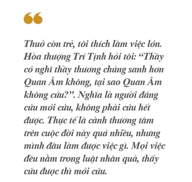 Thuở còn trẻ, tôi thích làm việc lớn. Hòa thượng Trí Tịnh hỏi tôi: “Thầy có nghĩ thầy thương chúng sanh hơn Quan Âm không, tại sao Quan Âm không cứu?”. Nghĩa là người đáng cứu mới cứu, không phải cứu hết được. Thực tế là cảnh thương tâm trên cuộc đời này quá nhiều, nhưng mình đâu làm được việc gì. Mọi việc đều nằm trong luật nhân quả, thấy cứu được thì mới cứu.
