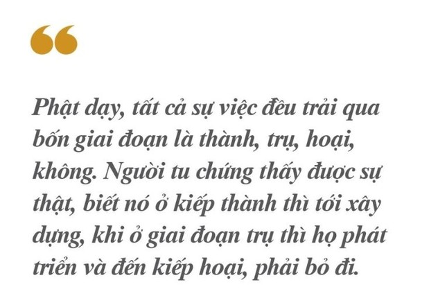 Phật dạy, tất cả sự việc đều trải qua bốn giai đoạn là thành, trụ, hoại, không. Người tu chứng thấy được sự thật, biết nó ở kiếp thành thì tới xây dựng, khi ở giai đoạn trụ thì họ phát triển và đến kiếp hoại, phải bỏ đi. Thí dụ Học viện này mười năm trước bỏ hoang, nhưng hiện tại nó đang ở giai đoạn thành, chúng ta đầu tư phát triển được là hiểu đạo. Tôi đề xướng, nhưng làm được nhờ Hội đồng Điều hành mỗi người một tay đóng góp công sức nên việc thành tựu dễ dàng. Nhưng nếu đến kiếp hoại, kiếp không, thì ở lại cũng phải gánh luôn cái quả xấu. Vì vậy, Tổ Thiên Thai dù được vua Trần kính trọng, nhưng biết nhà Trần sắp hết thời, ngài đã rời bỏ kinh đô, về ẩn tu ở núi Thiên Thai, bên dòng suối Ngọc Tuyền.